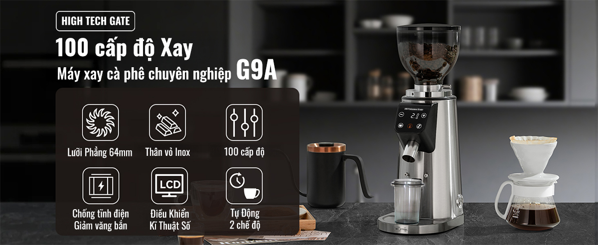 Ở G9A - được trang bị 100 mức điều chỉnh độ mịn, cho phép kiểm soát chi tiết kích thước hạt cà phê, đảm bảo độ phù hợp tối ưu cho từng kiểu pha – từ espresso đậm đặc đến pour-over thanh nhẹ.