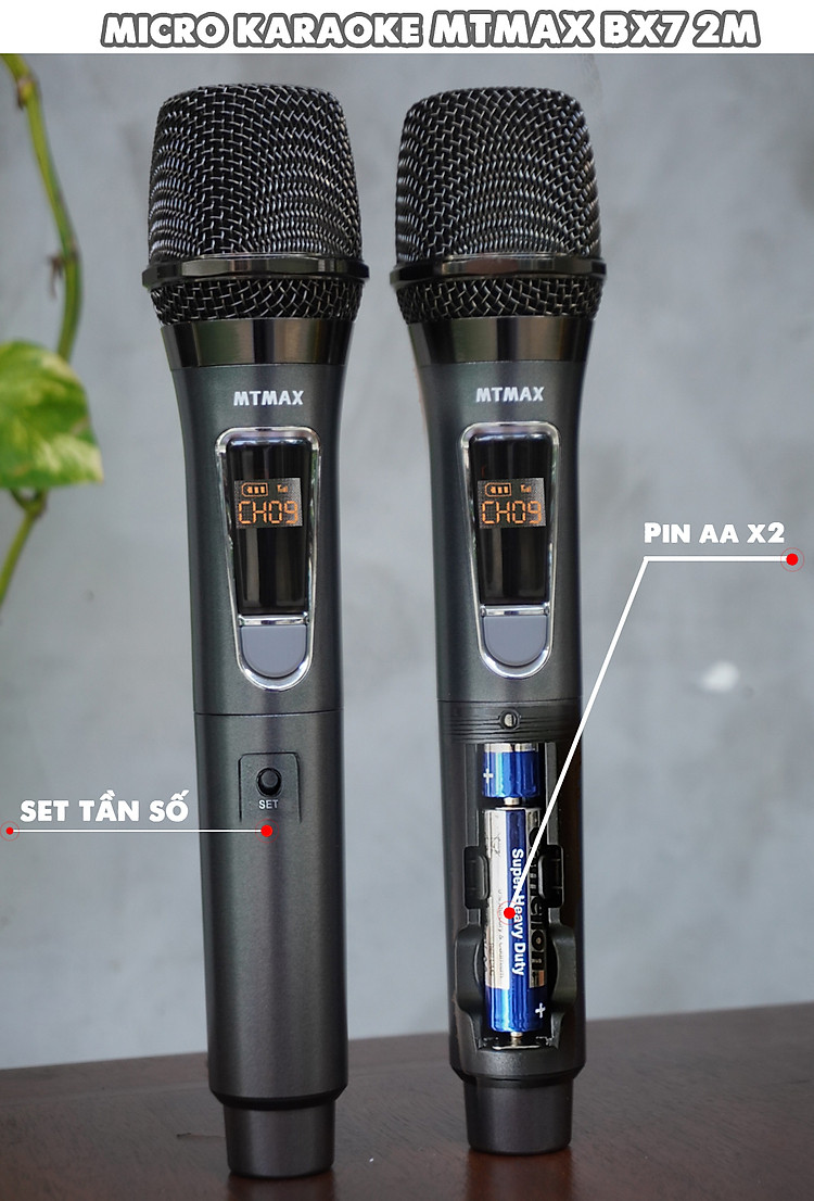 Micro karaoke BX7-2M có pin dễ thay thế, khác với các loại micro khác trên thị trường sử dụng pin sạc thì bộ này sử dụng pin AA có thể thay thế dễ dàng không như loại pin sạc sau này thay thế sẽ khó khăn và khó kiếm