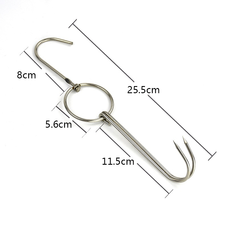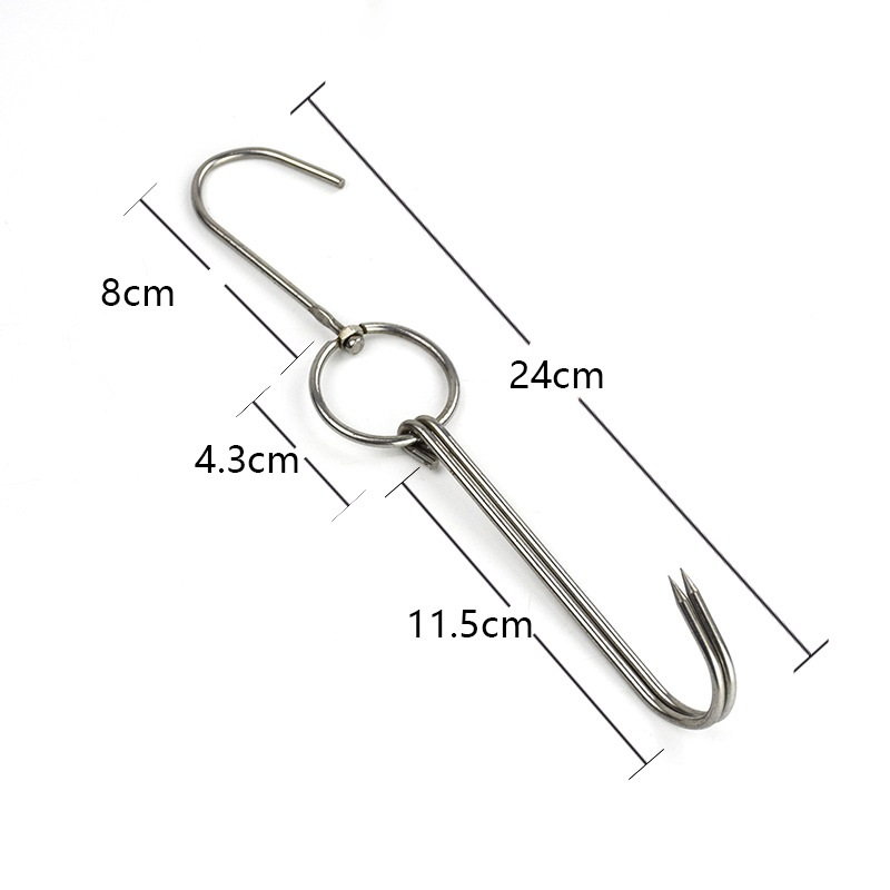 Chất liệu thép không gỉ đã qua xử lý ở nhiệt độ cao có khả năng chống gỉ tốt, giữa sản phẩm có một khoen lớn, được nối với 2 móc lớn, thuận tiện cho việc treo các đồ vật có trọng lượng lớn như vịt quay,