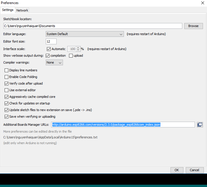 http://arduino.esp8266.com/stable/package_esp8266com_index.json ,sau đó vào trên Arduino IDE,các bạn vào File -> Preferences rồi dán link vào khung như hình ở dưới.