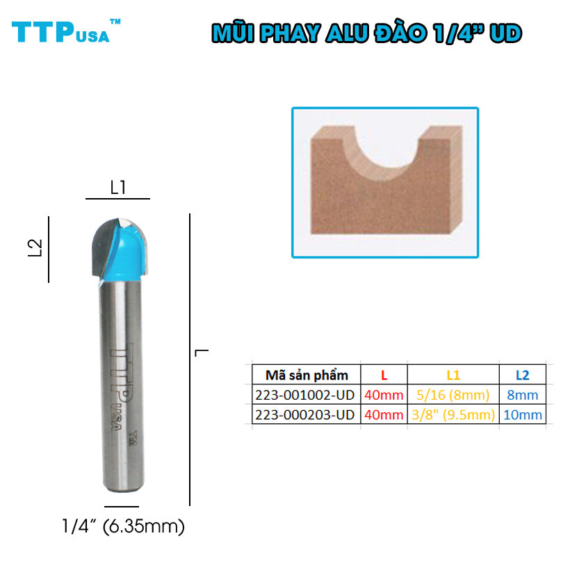 - Mũi Phay Đào Alu TTPusa UD có thể sử dụng cho máy bàn hoặc máy soi cầm tay có phi chuôi là 6.35mm dùng để phay tạo rãnh hình bán nguyệt hoặc khoét lỗ tròn.