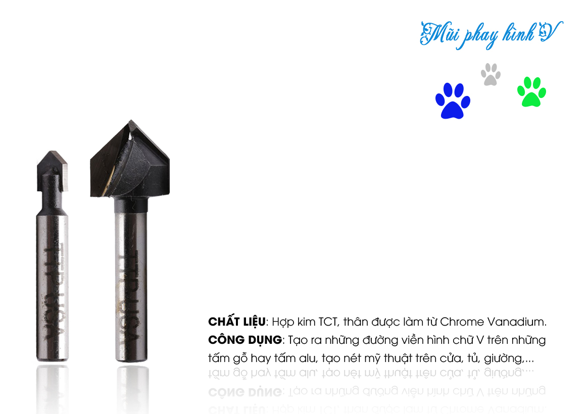 - Mũi phay V Alu TTPusa được làm bằng hợp kim TCT, đây là dạng mũi phay chữ V, có khả năng chịu nhiệt cao, cắt được mọi loại gỗ, nhôm khối, alu.. giúp tạo nên những đường rãnh đồng đều trên nhiều bề mặt chất liệu khác nhau.