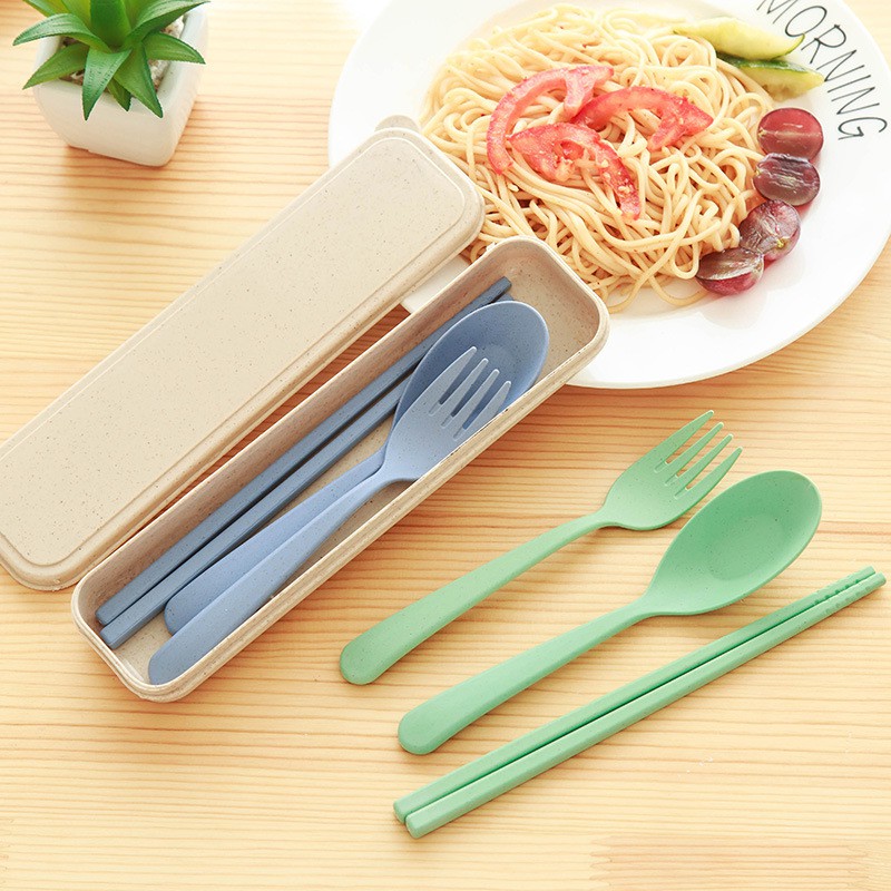 Bộ Muỗng Đũa Nĩa Inox Dùng Bữa Kèm Hộp Đựng Nhựa Lúa Mạch