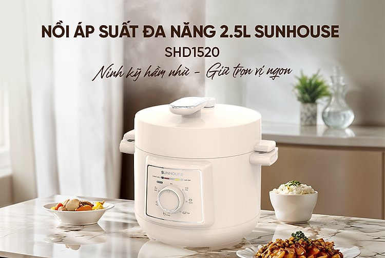 Nồi áp suất đa năng 2.5L SUNHOUSE SHD1520 là trợ thủ nhà bếp hiện đại dành cho những ai yêu thích sự tiện lợi mà vẫn đề cao dinh dưỡng. Với thiết kế gọn nhẹ, dung tích vừa đủ 2.5L cùng công suất mạnh mẽ, sản phẩm giúp bạn chế biến nhanh chóng đa dạng món ăn: từ ninh xương, hầm canh đến nấu cháo, nấu cơm,... Cơ chế nấu áp suất giúp thực phẩm chín mềm trong thời gian ngắn nhưng vẫn giữ nguyên dưỡng chất và hương vị, đáp ứng trọn vẹn cả nhu cầu ngon miệng lẫn tốt cho sức khỏe.