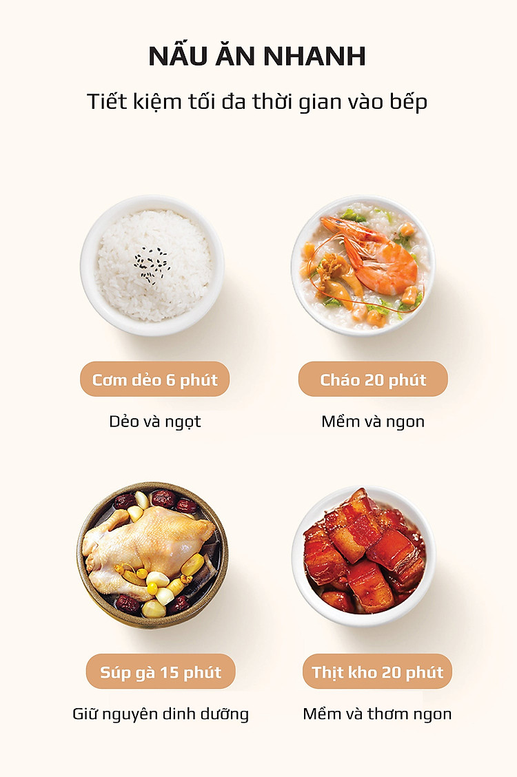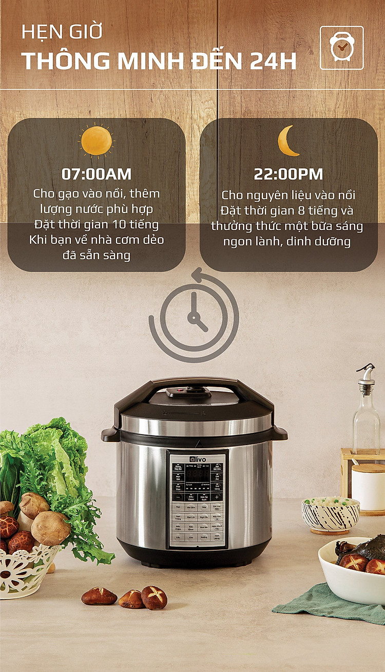 - Với tính năng hẹn giờ lên tới 24h sẽ giúp bạn nấu món ngon mọi lúc, phù hợp với những người bận bận rộn, dân công sở, có ít thời gian cho việc nội trợ.