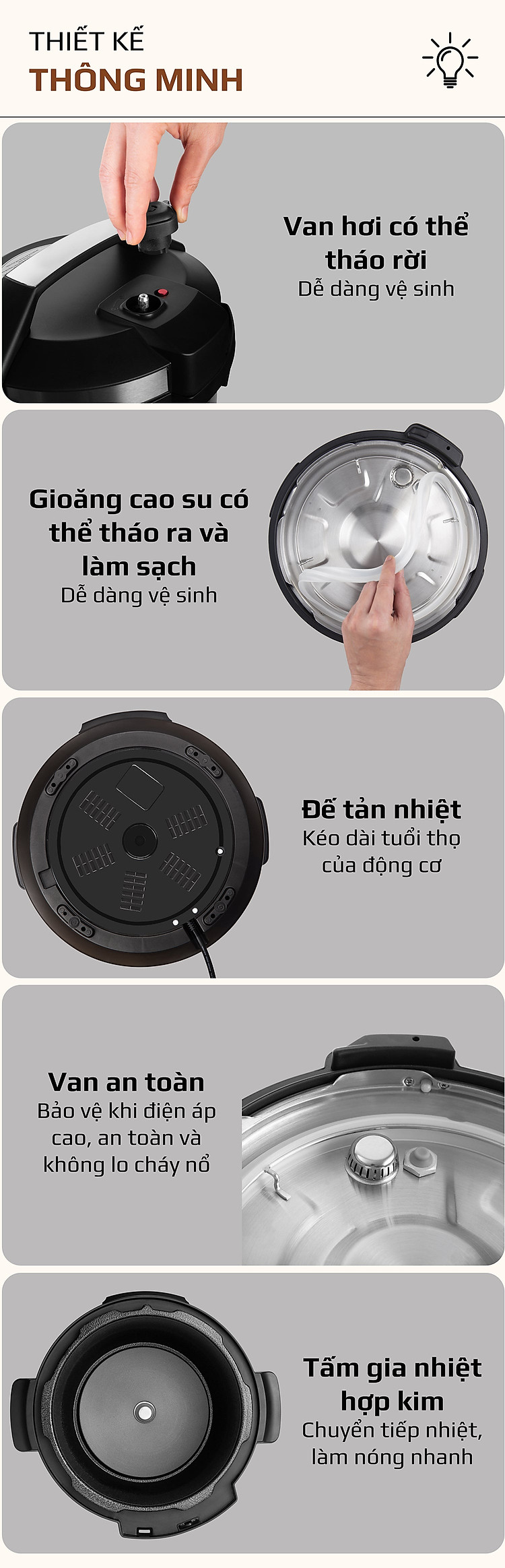 - Nồi được trang bị van áp suất an toàn tuyệt đối, giúp giữ áp suất khi nấu, và xả áp suất sau khi nấu xong. Van áp suất kết hợp cùng với các cảm biến điện tử giúp nồi điều chỉnh mức áp suất vừa đủ trong nồi trong quá trình nấu không còn lo vấn đề quá áp suất gây nguy cơ phát nổ như những nồi truyền thống.