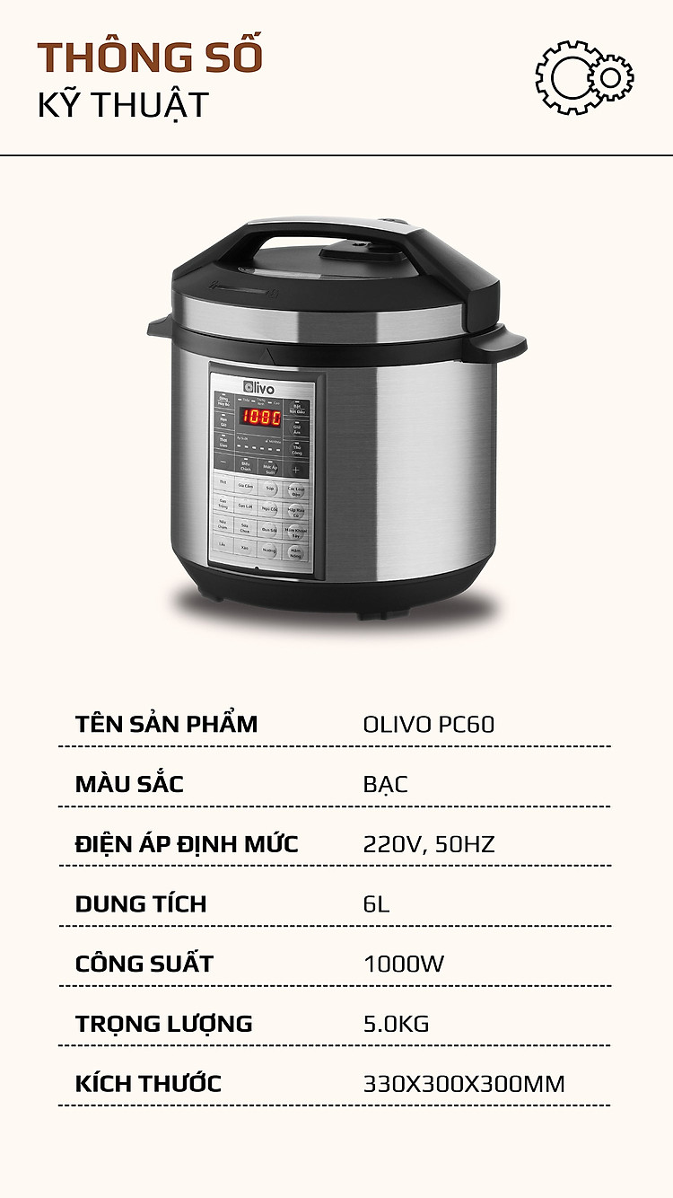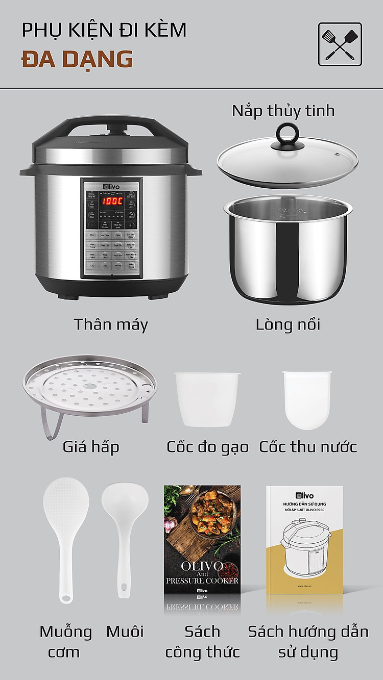 - Với dung tích lòng nồi lớn tới 6 lít Olivo PC60 là một trong những nồi áp suất đa năng có dung tích lớn nhất trên thị trường hiện nay