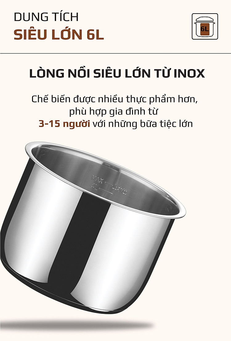 - Dung tích lớn 6L giúp người sử dụng có thể chiến biến lượng thực phẩm nhiều hơn, đảm bảo phù hợp với những gia đình đông người có số lượng từ 6-8 người.