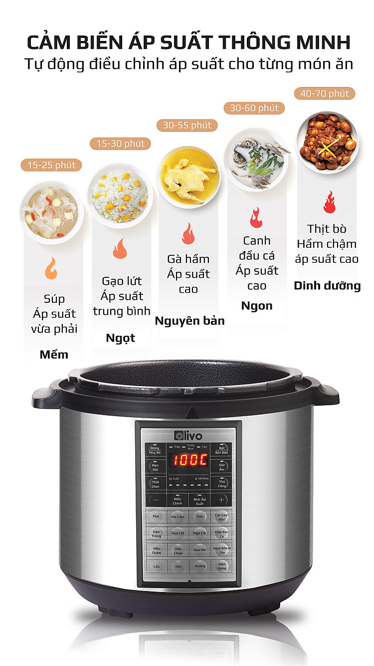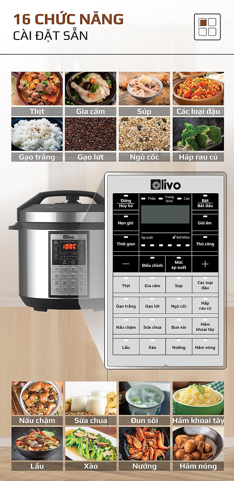 - Những chế độ nấu ăn cơ bản của nồi áp suất Olivo PC60 đó là: Thịt, Gia Cầm, Súp, Các Loại Đậu, Gạo Trắng, Gạo Lứt, Ngũ Cốc, Hầm Rau Củ, Nấu Chậm, Sữa Chua, Đun Sôi, Hầm Khoai Tây, Lẩu, Xào, Xướng, Hâm Nóng.