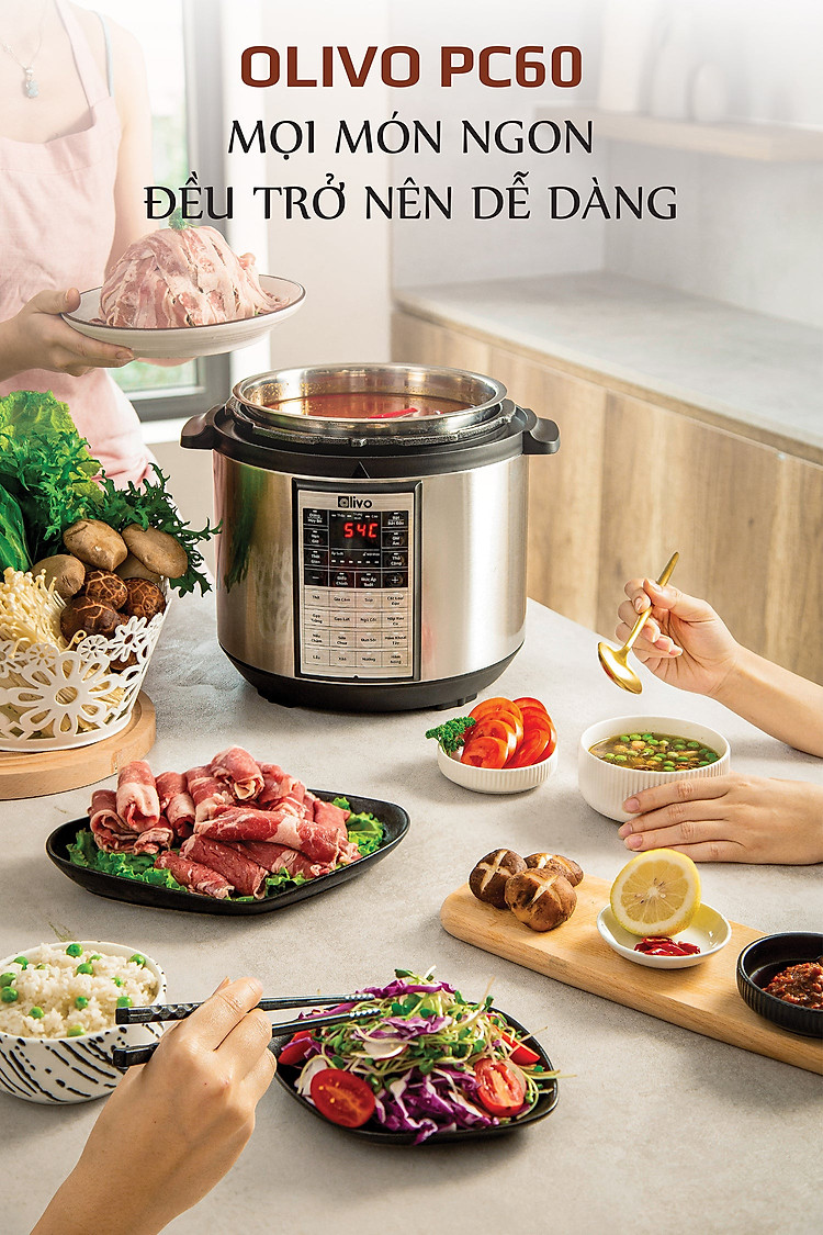 - Một trong những ưu điểm tuyệt vời của nồi áp suất điện Olivo PC60 đó là ở sự đa năng trong việc chế biến những món ăn tuyệt hảo theo từng nhu cầu của các bà nội trợ.