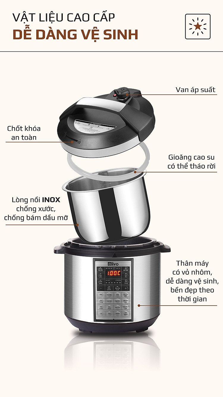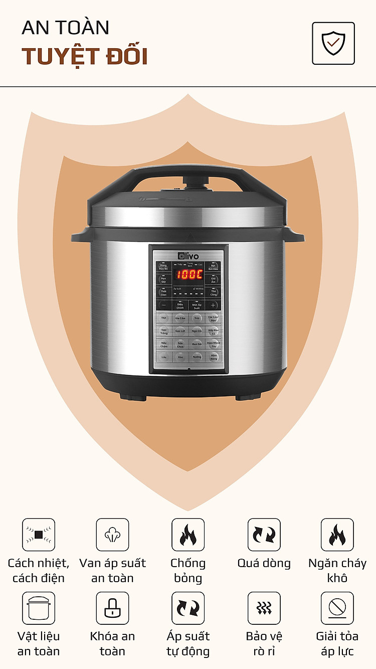 - Nồi áp suất điện Hàng Chính Hãng Olivo PC60 có những thiết kế và tính năng an toàn vượt trội so với dòng nồi áp suất cơ thông thường phổ biến hiện nay.