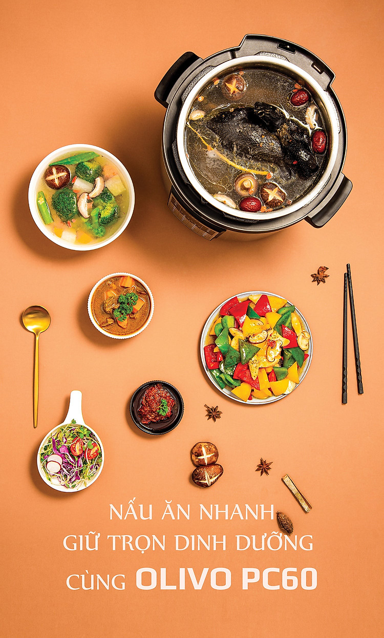 - Không cần bạn phải quá xuất sắc hay giỏi việc nội trợ bếp núc, tất cả chỉ còn là công việc đơn giản khi có nồi áp suất đa năng này, công việc của bạn chỉ việc chuẩn bị thực phẩm còn lại tất cả hãy để cho Olivo PC60 lo.