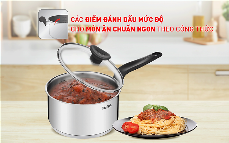 Nồi cán dài quánh inox Tefal còn có các điểm đánh dấu mức độ dễ nhìn thấy, giúp bạn chủ động hơn dung tích nước mà mình sử dụng cũng như khối lượng thực phẩm nấu. Tạo nên sự thoải mãi khi sử dụng nồi này.