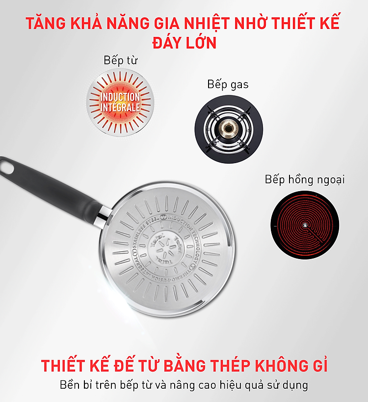 Nồi chảo Tefal có đáy làm bằng thép không gỉ gia cố giúp tản nhiệt cực tốt và nâng cao hiệu quả sử dụng.