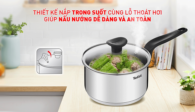 Nồi inox Tefal có thiết kế mới lạ, hiện đại với nắp nồi trong suốt dễ dàng nhìn thấy thức ăn bên trong nồi, giúp bạn dễ dàng quan sát thực phẩm bên trong đang chín tới mức độ như thế nào.