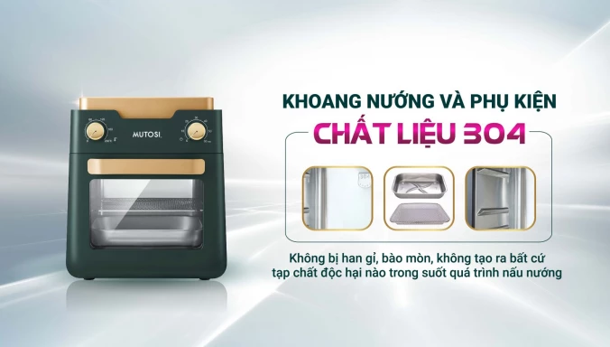 Khoang nướng và các phụ kiện tiếp xúc trực tiếp với thực phẩm được làm hoàn toàn bằng Inox 304 cao cấp, bền bỉ, an toàn tuyệt đối với sức khỏe người dùng.