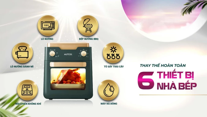 Nấu đa dạng các món: chiên, nướng, bánh mì, bánh ngọt, caramen,…, tối ưu diện tích bếp, tiết kiệm chi phí bằng việc “mua 1 được 6”: nồi chiên không khí, lò nướng bánh mì, lò nướng, bếp nướng BBQ, tủ sấy trái cây, máy rã đông.