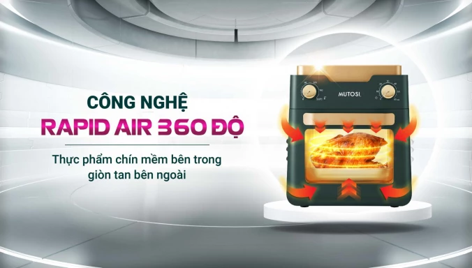 Cơ chế quạt gió đẩy luồng khi nóng lưu thông 360* quanh khoang nồi giúp thức ăn được chín từ trong ra ngoài và đều các mặt mà không cần lật trở, giảm hơn 80% lượng mỡ thừa trong thức ăn,