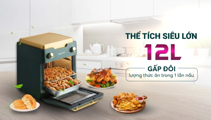 Thể tích lớn 12L, gấp đôi thể tích của nồi chiên không dầu bình thường, giúp bạn có thể nấu một lượng lớn thức ăn trong một lần duy nhất, tiện dụng với những bữa ăn đông người.