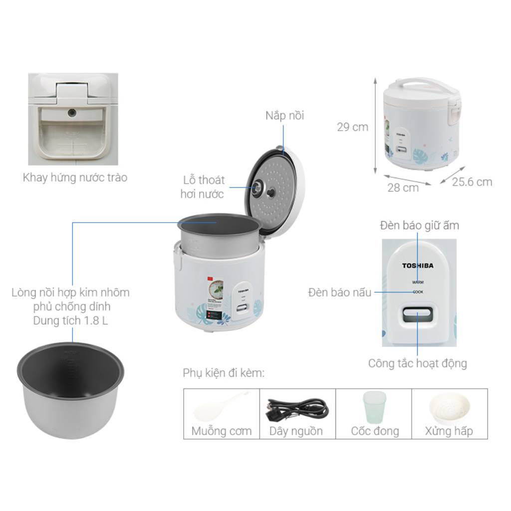 | Kích thước | Thông số kỹ thuật của Nồi cơm điện Toshiba RC-18JH2PV(B)Model: RC-18JH2PV(B)Dung tích: 1.8LMàu sắc: Trắng xanhNguồn điện cung cấp: 220V / 50-60HzGiữ ấm: 6HCông suất: 650WVật liệu thân: Thép phủ sơnVật liệu nắp: NhựaLòng nồi: 1mm chống dínhChế độ nấu: Cơm trắng, hấp, giữ ấmNgôn ngữ hiển thị: Tiếng AnhDây nguồn Chiều dài (m): Loại tháo rời / 1.3Linh kiện tặng kèm: Cốc đong gạo, vá xới cơm, vỉ hấpKích thước sản phẩm (DxRxC): 280x263x289 mmTrọng lượng: 2.4 KgNhà sản xuất: ToshibaXuất xứ: Trung QuốcBảo hành: 12 tháng |