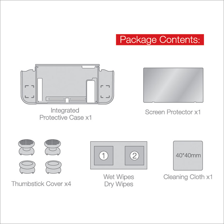 Bộ sản phẩm bao gồm case ốp máy, dán bảo vệ màn hình, bọc cao su núm joystick cho analog Joy-Con, khăn ướt / khăn lau khô, khăn lau máy