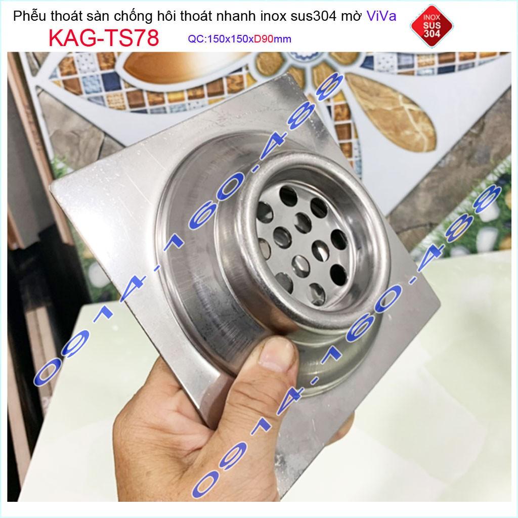 Phễu thoát sàn Viva KAG-TS78 15x15cm D90, phễu thoát sàn SUS304 đúc liền khối sales 40%, hố ga chống hôi inox 304 dày 1.5 ly