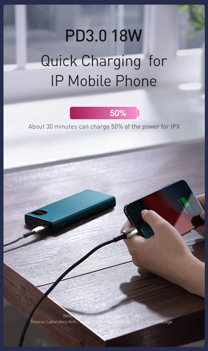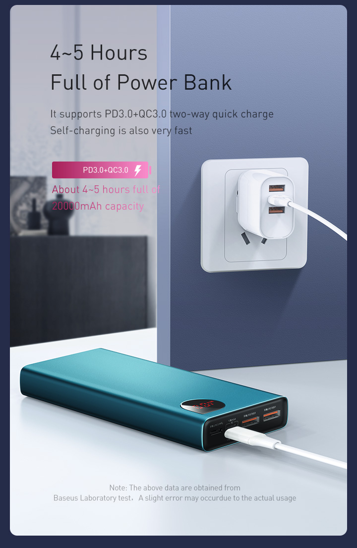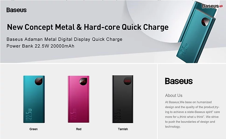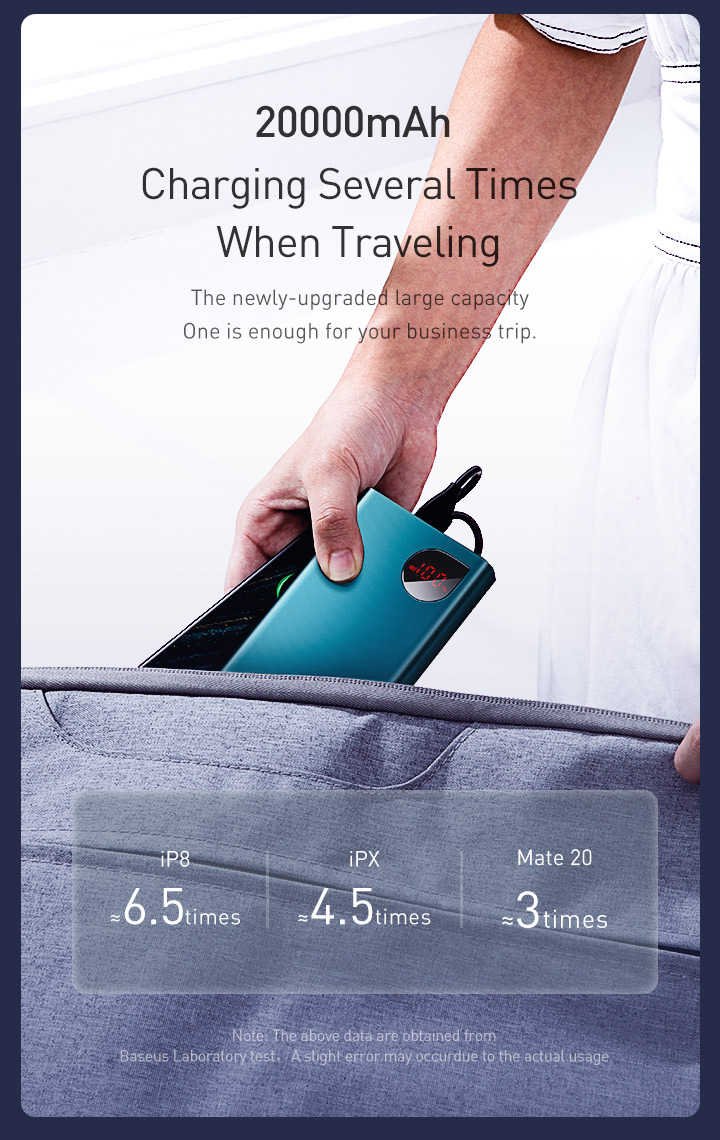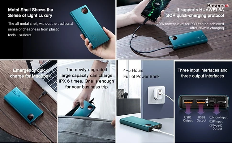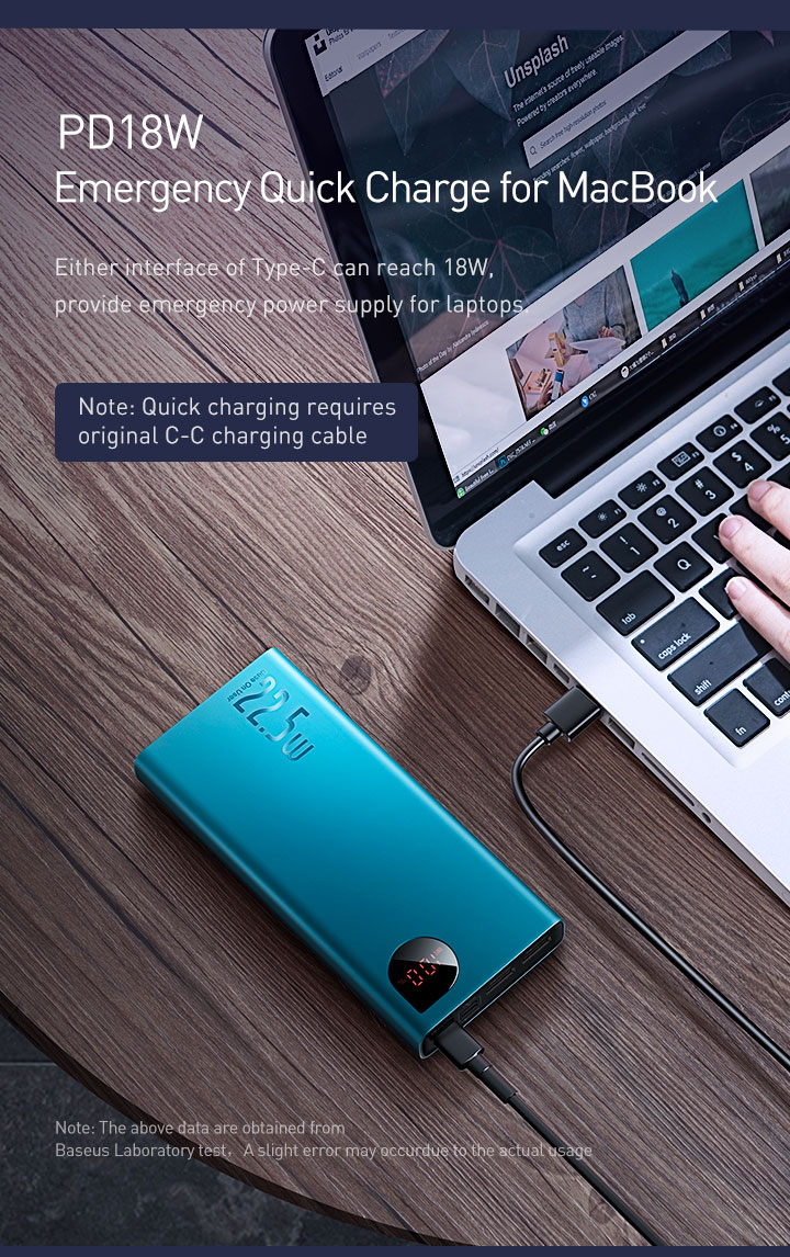 - Pin sạc dự phòng Baseus Adaman có dung lượng 20,000mAh, hỗ trợ hầu hết các chuẩn sạc nhanh hiện nay, tương thích với hầu hết các thiết bị số hiện nay từ Macbook/ Laptop cho đến Smartphone/ Tablet Dung lượng lớn, công suất, hiệu suất sử dụng cao lên đến 22.5W) có 3 port (2 USB + 1 Type C. Cả 3 Port này đều hỗ trợ sạc nhanh (QC3.0 và PD3.0) , có thể dùng sạc pin cho cả 3 thiết bị cùng lúc. Giúp bạn sử dụng thoải mái hơn và quên đi nỗi lo hết pin khi đi công tác, du lịch, giá ngoại Giúp cho mọi thiết bị của bạn luôn trong tình trạng sẵn sàng sử dụng .