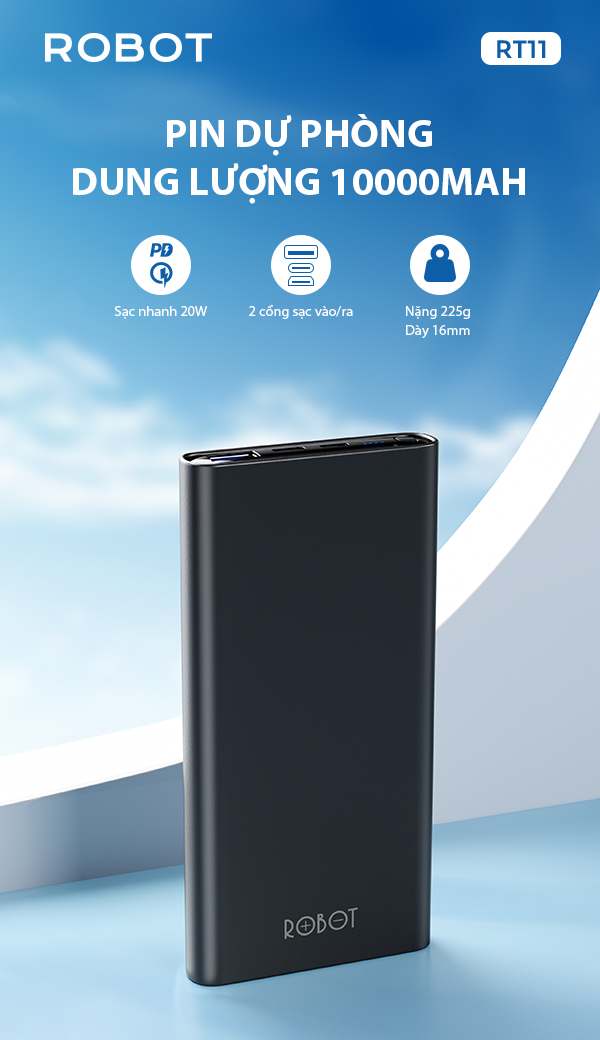 Pin Sạc Dự Phòng 10.000 mAh ROBOT RT11 Sạc nhanh 20W 2 cổng sạc vào/ra Thiết kế gọn nhẹ - HÀNG CHÍNH HÃNG