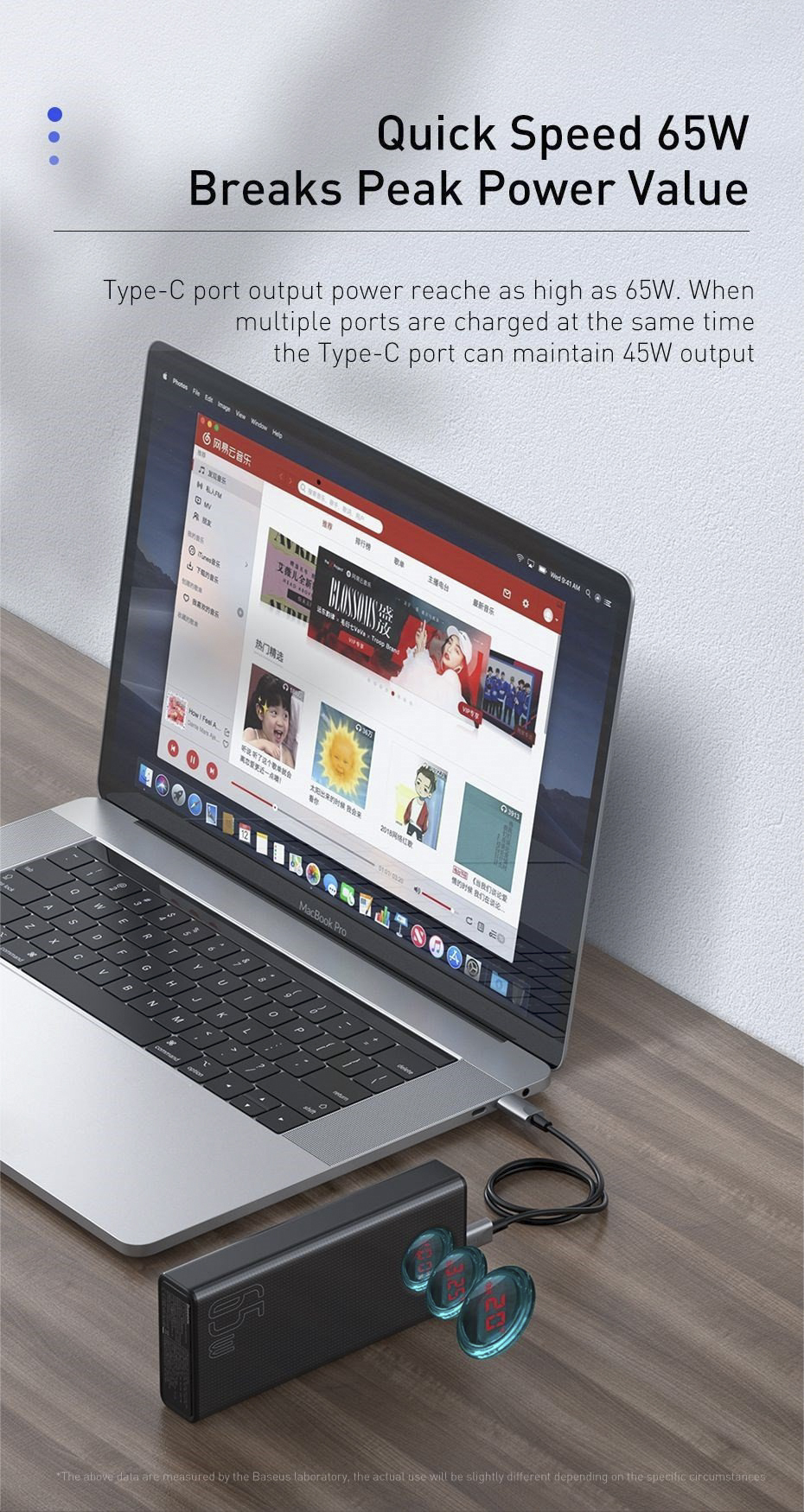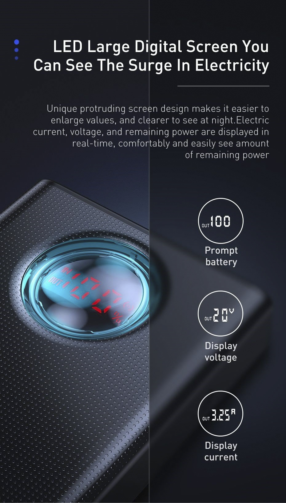 Baseus Amblight 65W cũng mang cho mình ngôn ngữ thiết kế bề mặt nhám chống bám mồ hôi, dấu vân tay. Màn hình led hiển thị dòng điện cũng như phần trăm pin khả dụng.