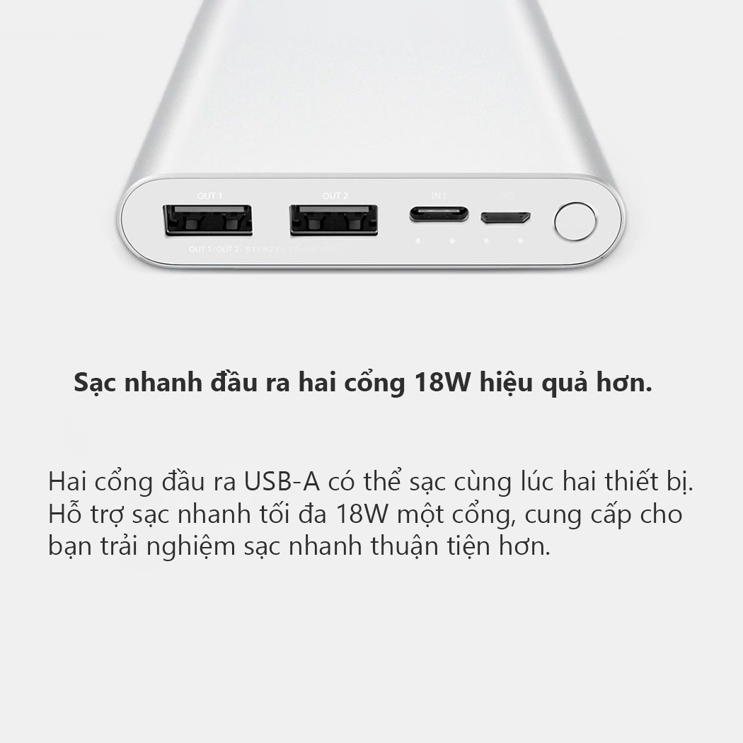 Trên viên Pin sạc dự phòng 10000mAh Xiaomi gen 3 nhà sản xuất đã trang bị đến  2 giao diện đầu vào micro-USB, USB-C và 2 đầu ra là USB-A vô cùng tiện lợi. Thiết kế này không chỉ cho phép người dùng có thể cùng lúc cung cấp năng lượng cho 2 thiết bị mà còn có thể linh hoạt sử dụng các giao diện cáp sạc khác nhau khi cần cung cấp năng lượng cho viên pin. Dung lượng 10000mAh cũng đáp ứng đầy đủ nhu cầu cung cấp năng lượng nhiều lần trên thiết bị, rất linh hoạt cho những chuyến đi xa.
