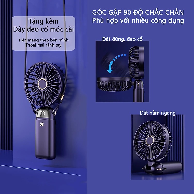 - Chức năng: Quạt mini đa năng tích điện, dùng cầm tay, để bàn, đeo cổ, làm giá đỡ điện thoại,