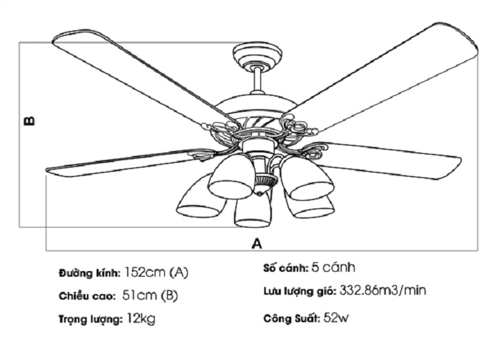 | Chất liệu | 5 chao đèn bằng thủy tinh·Thânquạtbằng thép không gỉ mạ màu đồng đỏ·Cánh quạt chất liệu gỗ màu 432c/5088·Cánh:cánh gỗ công nghiệp |