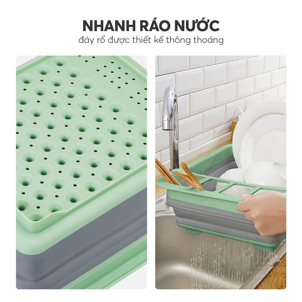 Rổ có thể gấp gọn và cất giữ dưới bồn rửa khi không sử dụng, tiết kiệm không gian, diện tích bảo quản