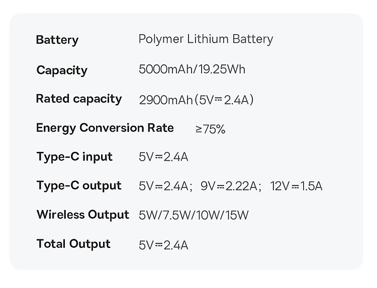 | Type-C Output | 5V-2.4A, 9V-2.22A, 12V-1.5A |