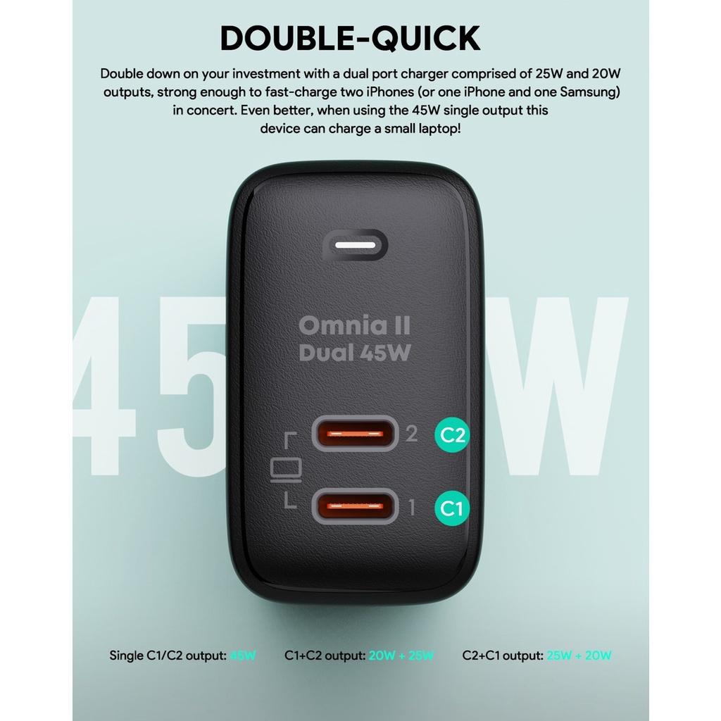 Được cải tiến bởi AUKEY OmniaChip, Omnia Duo 45W nhỏ hơn và nhẹ hơn 50% so với bộ sạc gốc 61W của Mac