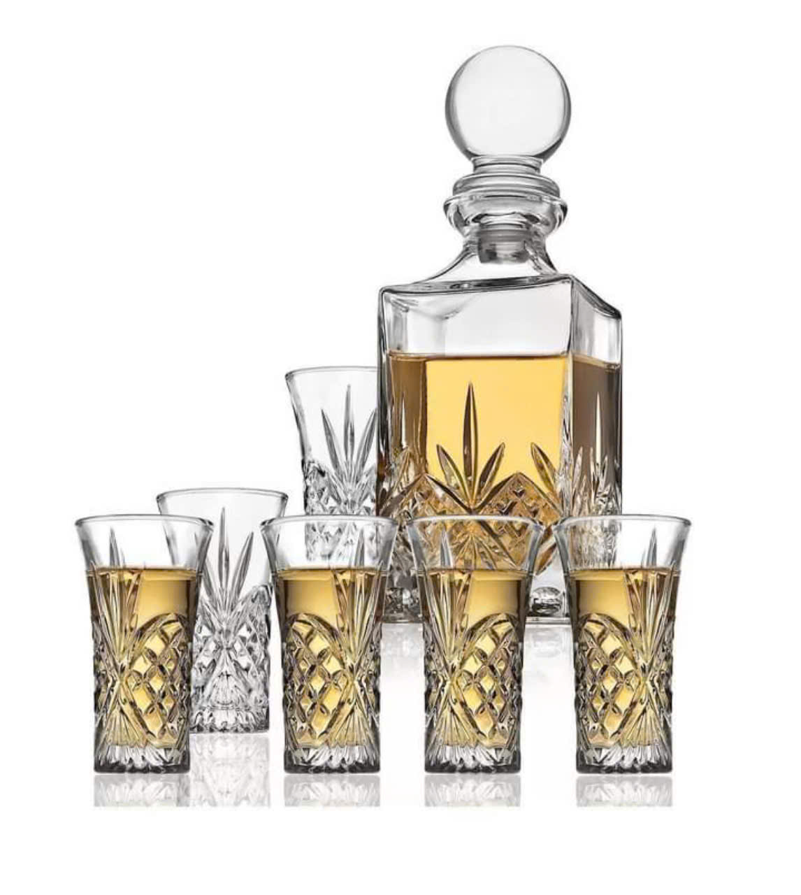Phục vụ những loại rượu mạnh theo phong cách thanh lịch cổ điển với thiết kế pha lê khắc trên bộ decanter Dublin bảy món của Godinger Dublin