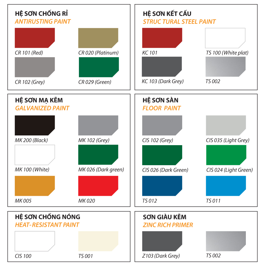 Hiện HTS Paint cung cấp màu sơn sắt mạ kẽm chống rỉ dưới đây. Tuy nhiên, với chủ đầu tư yêu cầu gam màu thẩm mỹ hơn, thì có thể liên hệ phòng kỹ thuật để HTS sản xuất gam màu theo mong muốn.