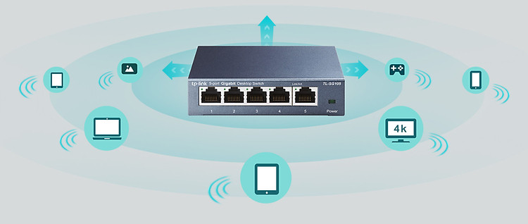Tăng cường tốc độ mạng của bạn với Switch Để bàn 5 cổng Gigabit TL-SG105. Không chặn, 5 cổng 10/100/1000Mbps cho phép truyền các tập tin lớn mà không bị nhiễu.
