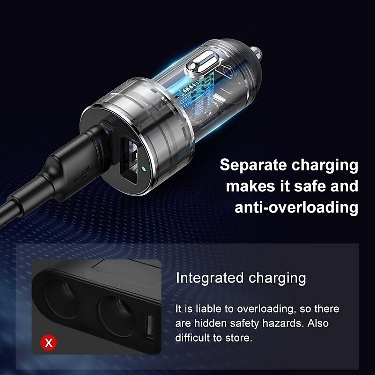 Tích hợp bộ chia, có thể gắn cùng lúc thêm 2 tẩu sạc (tổng gắn được 3 tẩu) . Dây cáp 60cm, dùng cho cả ghế trước và sau trên ô tô Inrput: 12-24V USB output: 5V 3.1A (Max) Cigarette lighter output: 80W (Max)