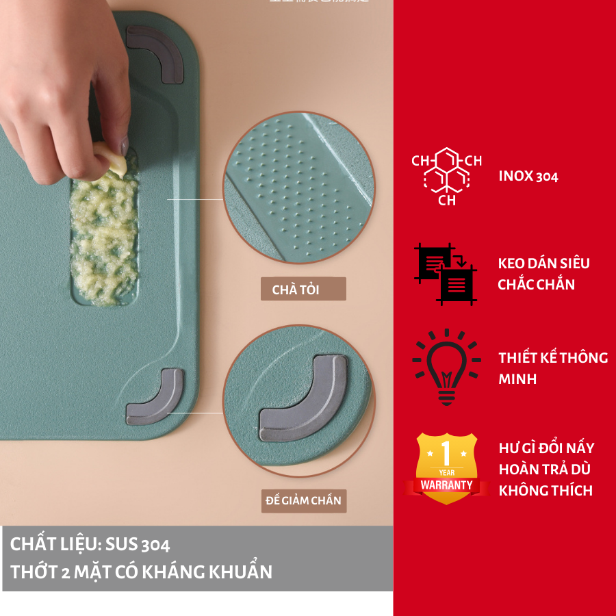==> 2 mặt KHÁNG KHUẨN phù hợp với từng công dụng: Mặt nhựa PP phù hợp để chặt xương, ... tránh gây tiếng ồn, mặt inox để thái thịt, rau,... dễ dàng vệ sinh