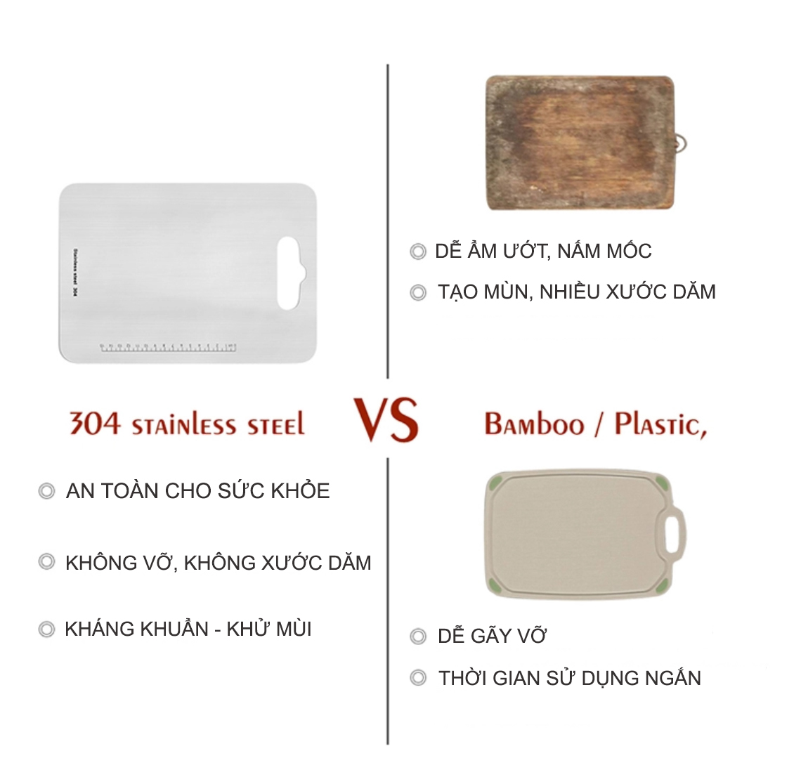 - Làm từ inox 304 cao cấp - loại inox có độ sáng bóng cao, bền vô đối, cực đẹp. Inox 304 được cả thế giới biết đến là không bị oxi hóa nên không bao giờ lo sợ thớt bị gỉ sét, nấm, ẩm, mốc. Luôn sạch sẽ, khô ráo, dễ dàng chùi rửa, an toàn vệ sinh.