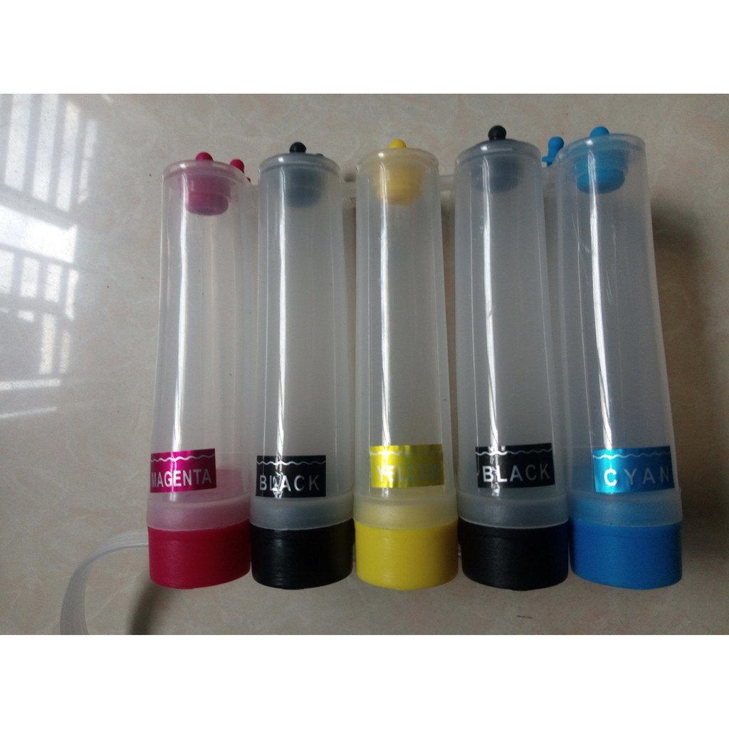 Bộ tiêp mực gồm 5 bình chứa mực: 2 màu đen, 1 màu xanh, 1 màu đỏ, 1 màu vàng.
