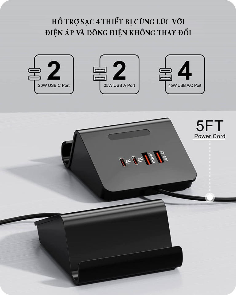 Trạm sạc nhanh để bàn cho điện thoại máy tính công suất 45W chuẩn PD20W với 4 cổng sạc, điện áp đầu vào 220V