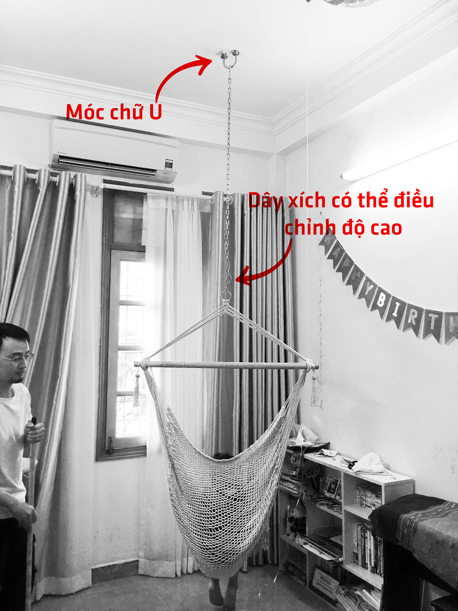 Còn nếu treo ở những chỗ đã có sẵn thanh dầm sắt, gỗ như mái hiên, nhà gỗ, nhà xưởng, hay dưới gốc cây thì quá đơn giản r ạ, lấy dây xích buộc bằng móc là xong luông.